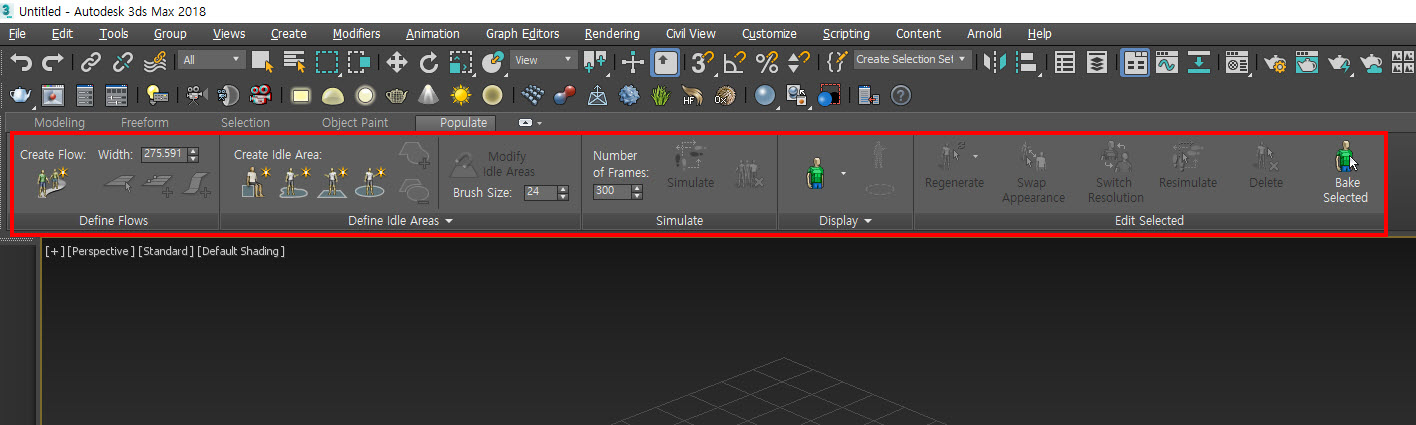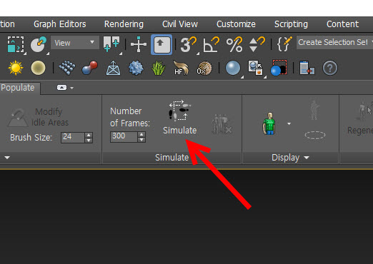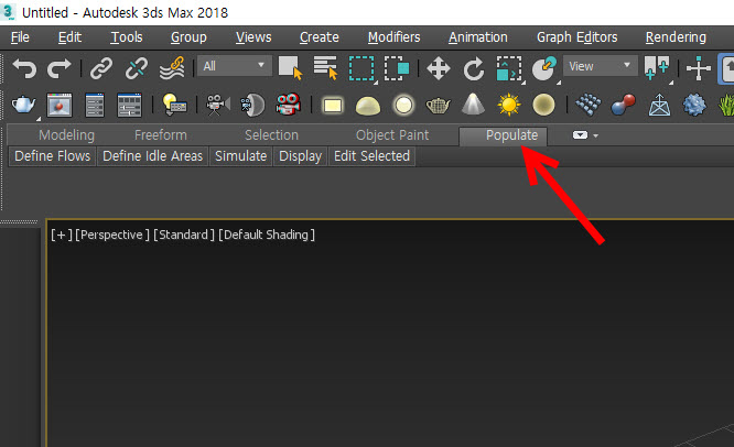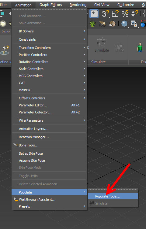 1)populate tool를 설치하고 3D맥스를 재실행합니다. populate tool를 정상적으로 설치하면 상단의 animation 메뉴에서 populate의 populate tool를 확인할수있습니다.
