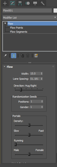 4)생성한 flow 오브젝트의 속성을 설정합니다(동선의 두께, 남성과 여성의 비율, 걷기, 달리기, 기타)