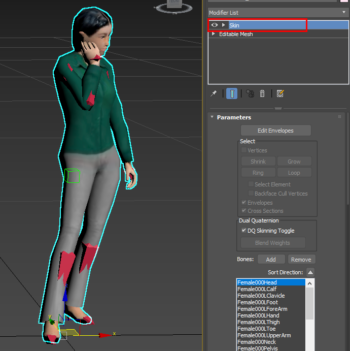 6)캐릭터 모델의 bone이 생성되고 skin이 추가되어있는것을 확인할수있습니다.