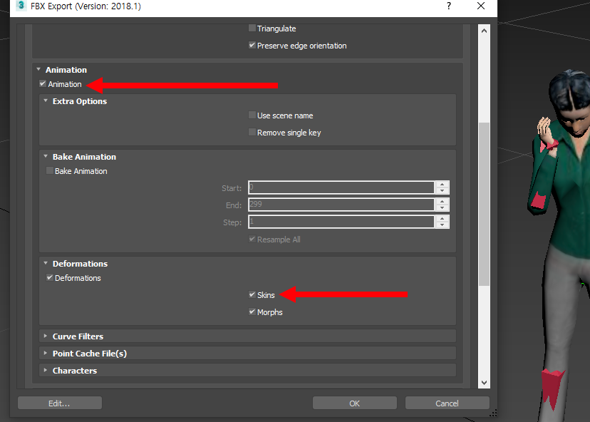 8)사람의 모델 및 애니메이션을 내보내기하려면 fbx export에서 animation에 체크하고 skins에 체크한후 확인합니다.