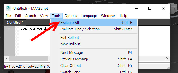 4)이 스크립트는 인구 시뮬레이션의 크기를 절반으로 설정합니다. 에디터 상단의 tools 메뉴에서 evaluate all를 선택합니다(ctrl+e)