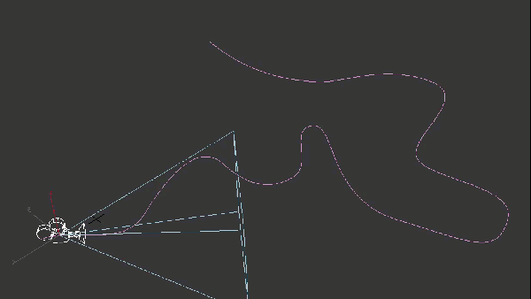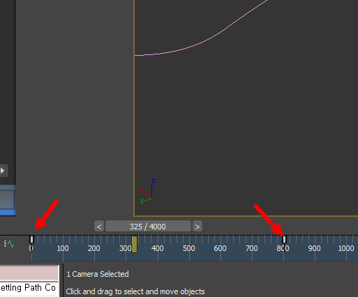 카메라 오브젝트가 라인(path) 위에 위치하고 타임 라인에서 시작과 끝 프레임에 키가 생성된것을 확인할수있습니다.