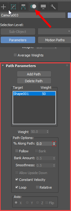 6)카메라 오브젝트를 선택하고 motion 패널에서 path의 속성을 변경할수있습니다(path parameters)