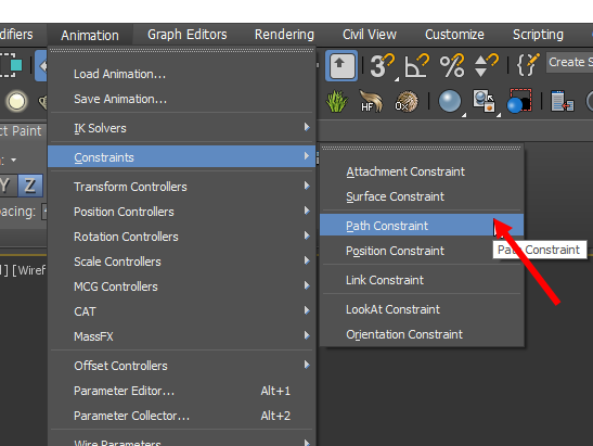 3)상단의 animation 메뉴에서 constraints의 path constraint를 선택합니다.