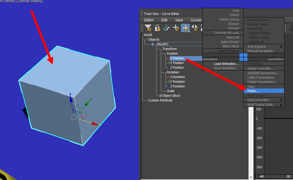 6)box 오브젝트를 선택하고 커브 에디터에서 동일한 속성을 선택, 마우스 우클릭한후 paste를 선택합니다.