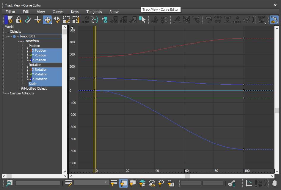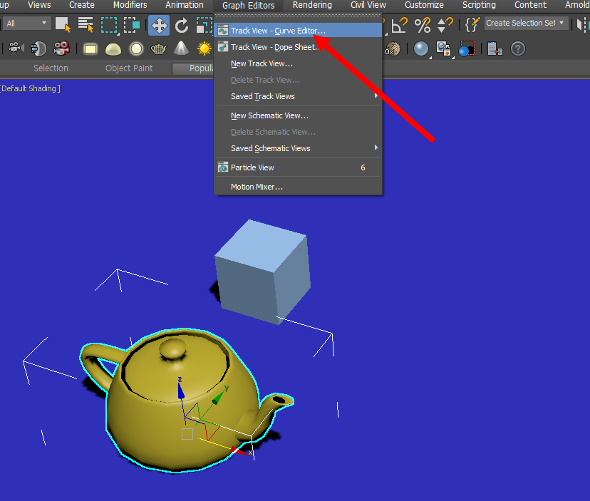 3)teapot 오브젝트에 설정한 애니메이션의 키를 box 오브젝트에 복사하려면 teapot 오브젝트를 선택하고 상단의 graph editors에서 track view - curve editor로 이동합니다.