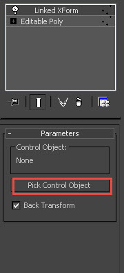 8)linked xform 수정자의 pick control object를 클릭하고 씬에 있는 포인트(point) 오브젝트를 선택합니다.