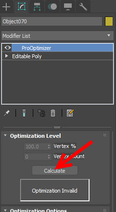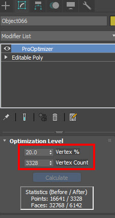 2)오브젝트를 선택하고 ProOptimizer 수정자를 추가한후 하단의 calculate를 클릭합니다.