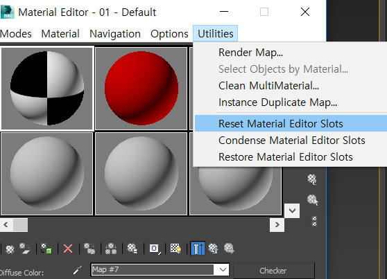 5)재질편집기의 utilities에서 reset material editor slots를 클릭하여 재질 편집기의 재질을 초기화합니다.