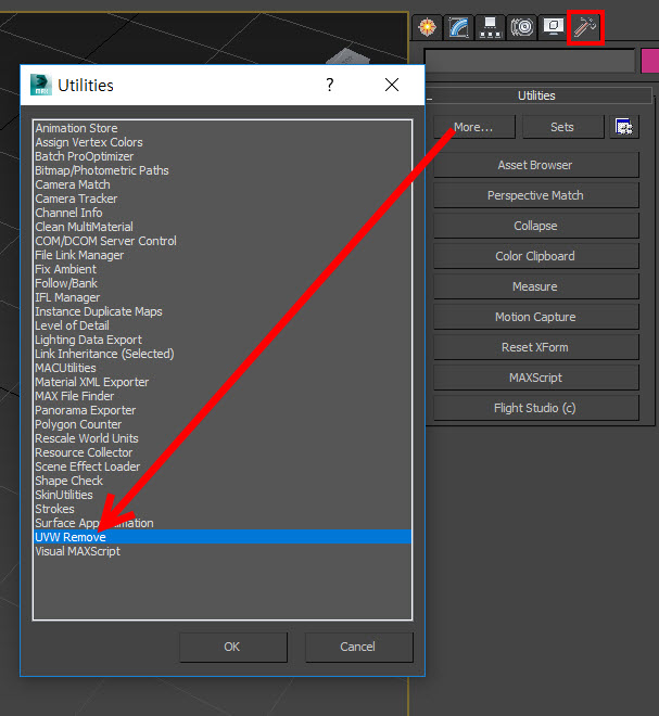 2)utilities의 more를 클릭하고 UVW Remove를 선택합니다.