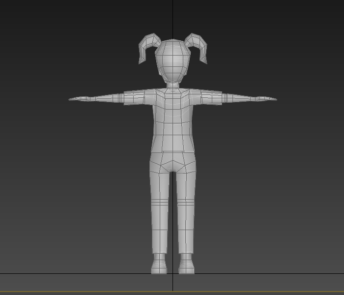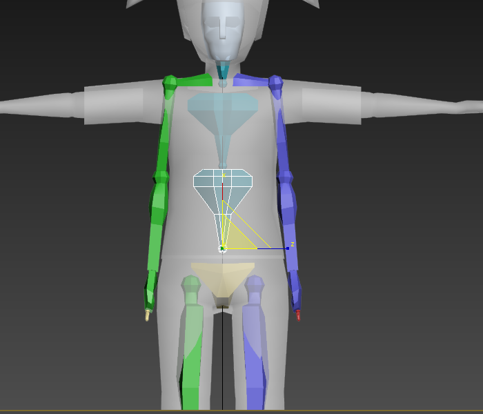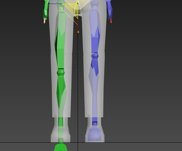 13)정면, 측면, 기타 뷰포트(Front, left, top, perspective)에서 확인하면서 바이패드의 구조를 캐릭터 모델에 적합한 구조로 변형합니다.