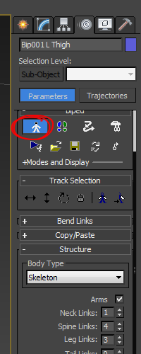 7)바이패드의 구조(structure)를 설정 또는 수정하기 이전에 biped의 피규어모드(figure mode)를 활성화합니다.