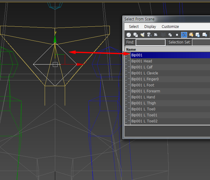 10)Bip001(com, center of mass)를 선택하고 캐릭터의 골반에 위치시킵니다.