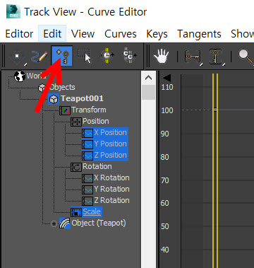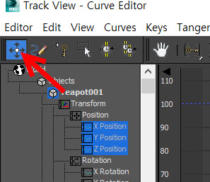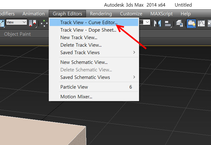 1)오브젝트의 키 애니메이션에 대한 곡선 그래프를 확인하고 편집하려면 상단의 graph editors 메뉴에서 track view - curve editor로 이동합니다.