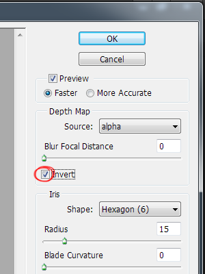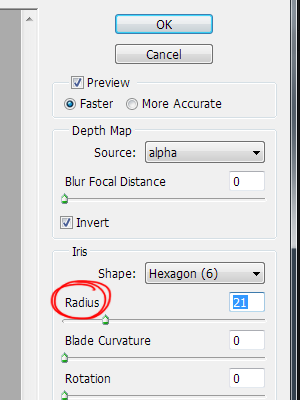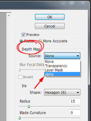 10)lens blur의 옵션에서 depth map의 source를 새로 추가한 채널로 설정합니다(alpha)