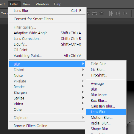 8)상단의 filter 메뉴에서 lens blur로 이동합니다.