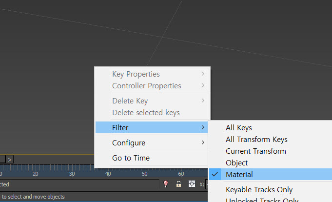 8)타임라인에서 마우스 우클릭하고 filter 메뉴에서 타임라인에 표시할 키를 필터링할수있습니다. 기본 모든 유형의 키를 표시하는 all keys에 체크되어있는것을 확인할수있습니다.