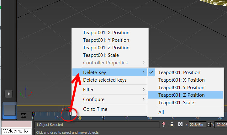 17)키를 제거하려면 키를 선택하고 마우스 우클릭 한 메뉴에서 delete key의 제거할 유형을 선택합니다. 키 제거 단축키는 delete 키를 사용합니다.