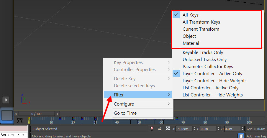 8)타임라인에서 마우스 우클릭하고 filter 메뉴에서 타임라인에 표시할 키를 필터링할수있습니다. 기본 모든 유형의 키를 표시하는 all keys에 체크되어있는것을 확인할수있습니다.