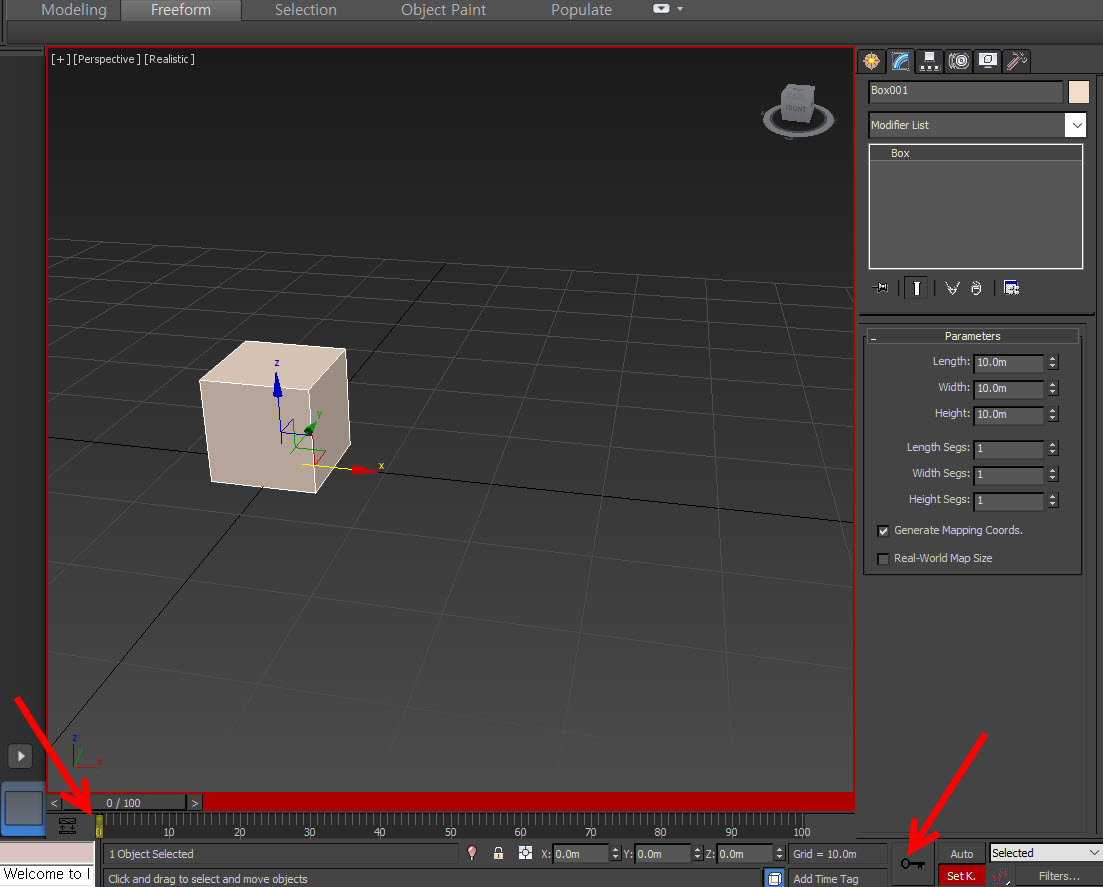 오브젝트의 애니메이션을 생성하려면 프레임에 키를 설정해야합니다. 키 설정 방법에는 사용자가 프레임에 직접 키를 설정하는 set key mode와 사용자가 오브젝트의 속성을 변화시키면 해당 프레임에 자동으로 키를 삽입하는 auto key mode 두가지 방법이있습니다.