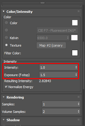 5)intensity, exposure의 수치를 조절하여 라이트의 밝기를 설정합니다.