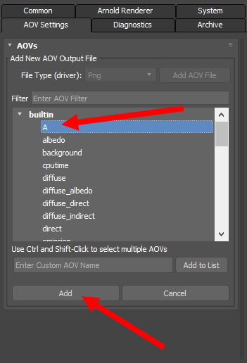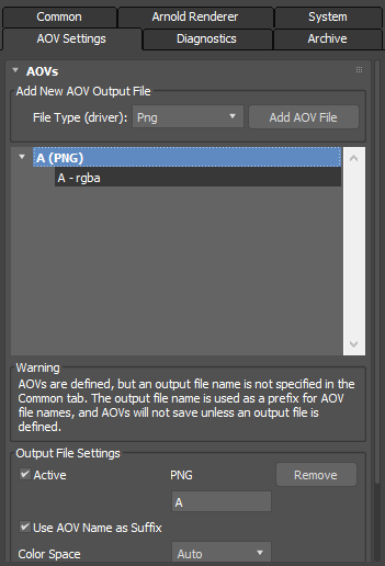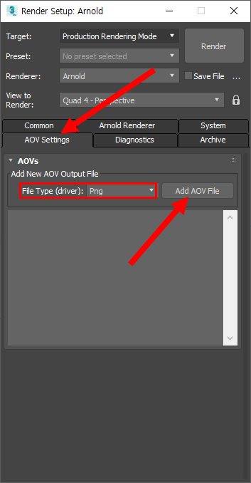 3)단일 이미지(single) 또는 시퀀스 이미지(sequence)를 렌더링할때 위와 같은 알파 채널의 이미지를 추가로 저장하려면 렌더 설정(render setup)의 AOV Settings탭에서 파일 형식을 선택하고 add AOV File을 클릭합니다.