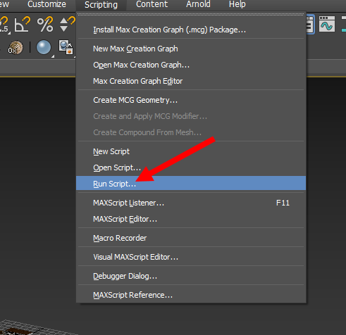 1)일반적으로 3D 맥스에서 스크립트를 실행하려면 상단의 scripting 메뉴에서 run script를 선택한후 사용자 스크립트를 선택합니다.