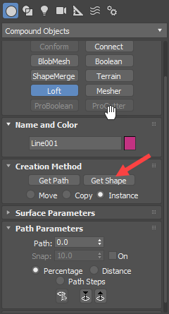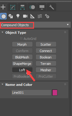 3)강의 물줄기(line1)를 선택하고 create의 compound objects에서 loft를 선택합니다.