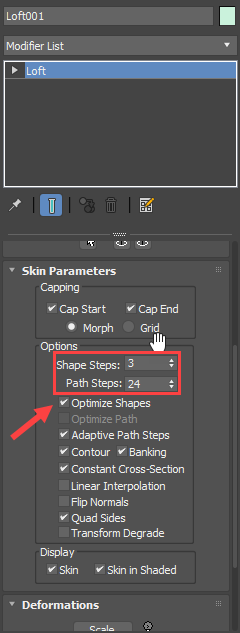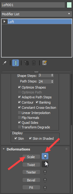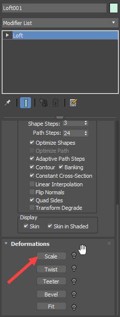 7)loft로 생성한 모델의 형태를 변형하려면 deformations의 scale로 이동합니다.