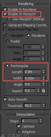 8)rendering 탭에서 enable in viewport에 체크하고 rectangular를 선택한후 length, width 수치를 입력합니다.