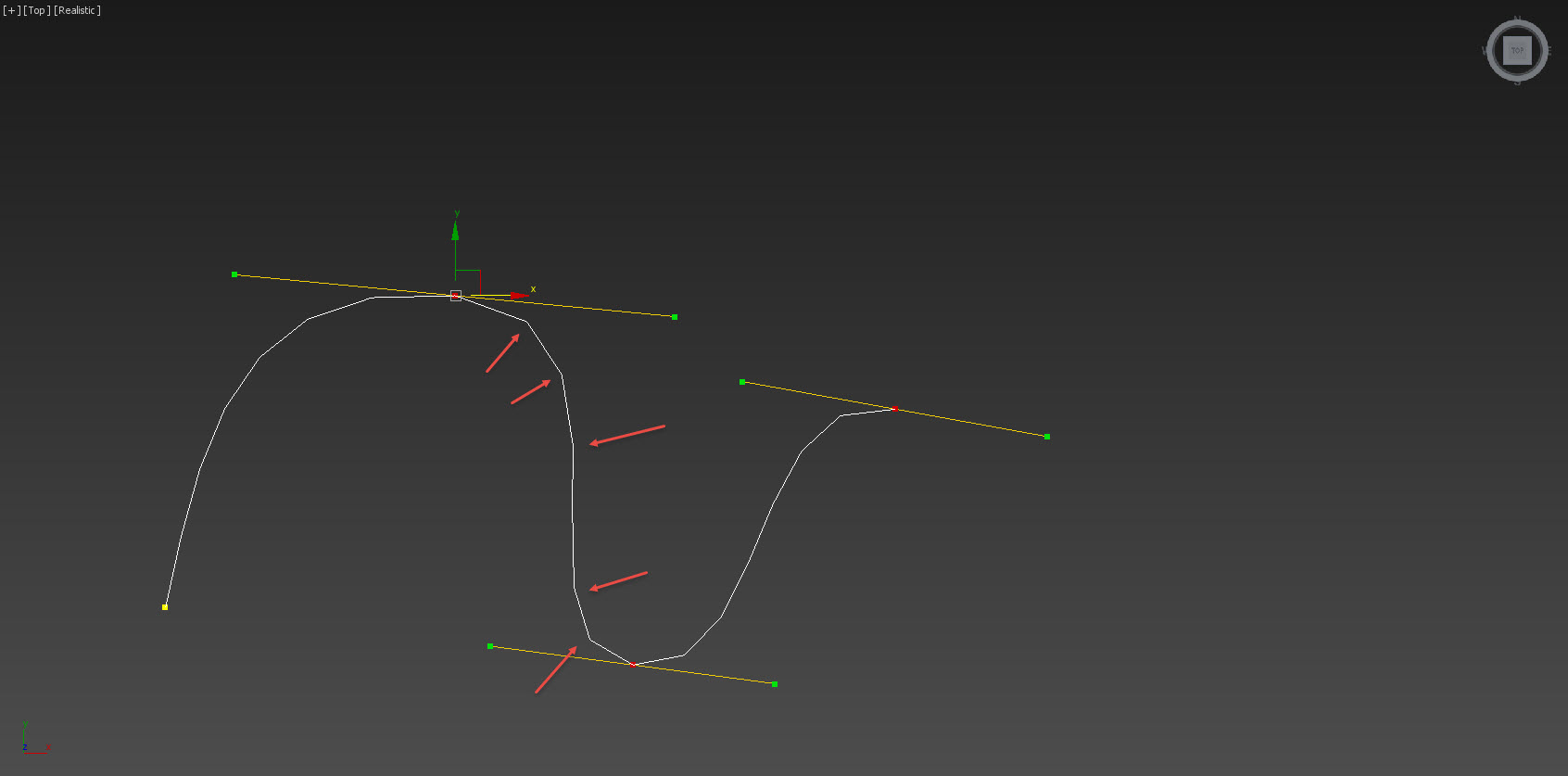 3)시작 정점 이외의 다른 정점들을 선택하면 베지어 곡선 핸들을 표시하는것을 확인할수있습니다. 핸들을 사용하여 곡선의 형태를 수정합니다.