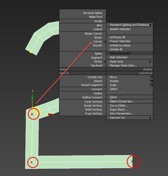 9)직선(corner 유형으로 설정한 정점 사이)는 보간하지않는것을 확인할수있습니다. 정점 유형을 선택하려면 정점을 선택하고 마우스 우클릭 메뉴에서 유형을 선택합니다(bezier corner, bezier, corner, smooth)
