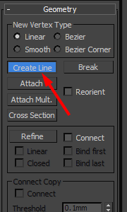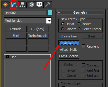 6)geometry의 attach를 선택하고 씬에서 귀속시킬 라인 오브젝트를 클릭합니다.