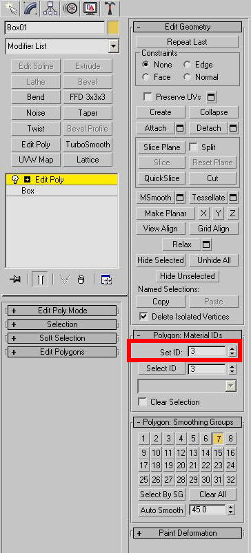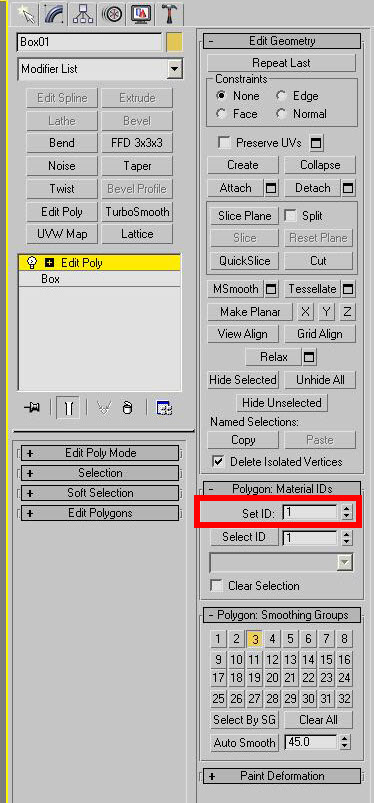 3)edit poly의 polygon:materialIDs에서 선택한 폴리곤의 아이디를 설정합니다(ID:1)