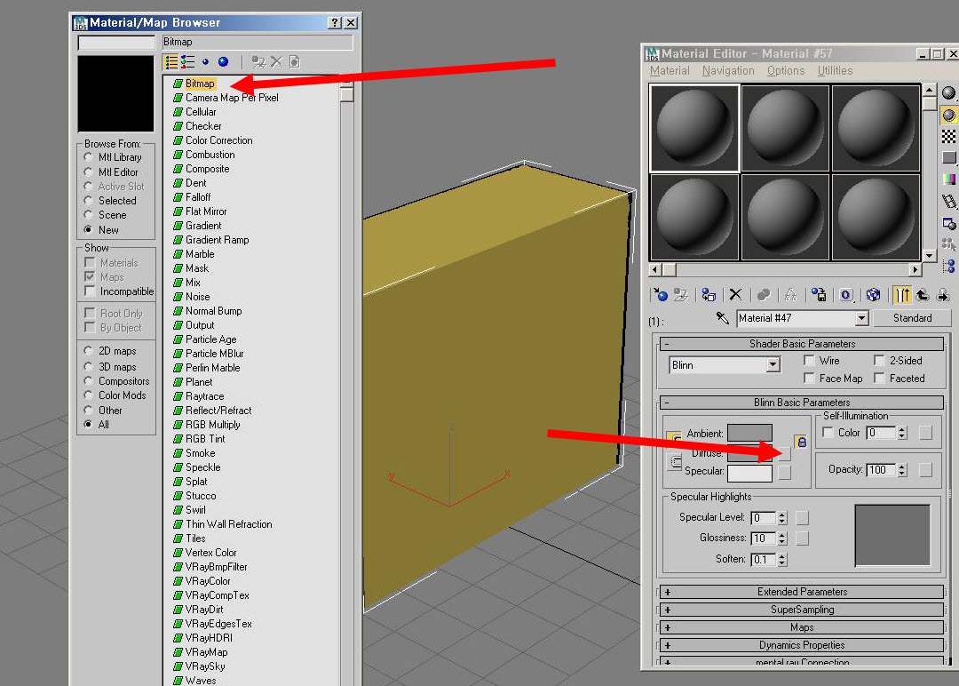 8)재질의 diffuse에 비트맵(bitmap)을 설정하고 텍스처 이미지를 설정합니다.