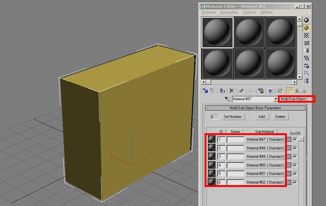 6)새로운 다중재질(multi/sub-object)을 생성하고 6개의 재질을 설정합니다.