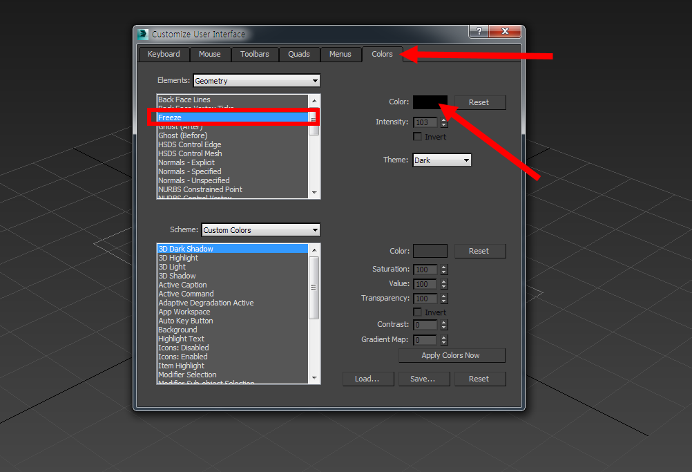 3D맥스에서 오브젝트의 freeze selection 색상 변경하기
