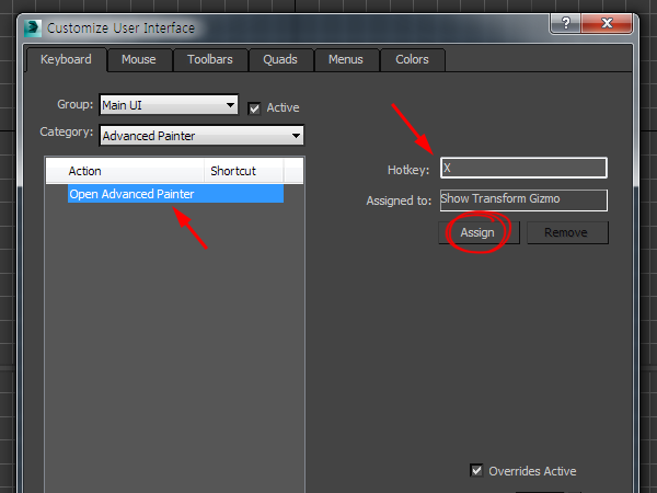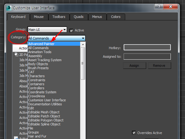 8)open advanced painter 액션을 선택하고 단축키를 할당합니다.