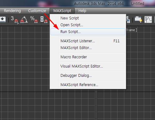 3)3D맥스를 실행하고 상단의 maxscript 메뉴에서 run script를 선택합니다.