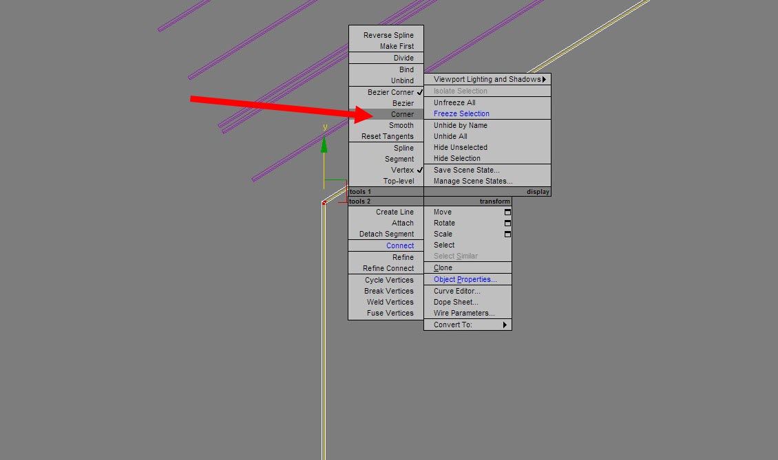 7)버텍스를 선택하고 마우스 우클릭 메뉴에서 corner를 선택하여 해당 버텍스를 코너 유형으로 설정합니다.