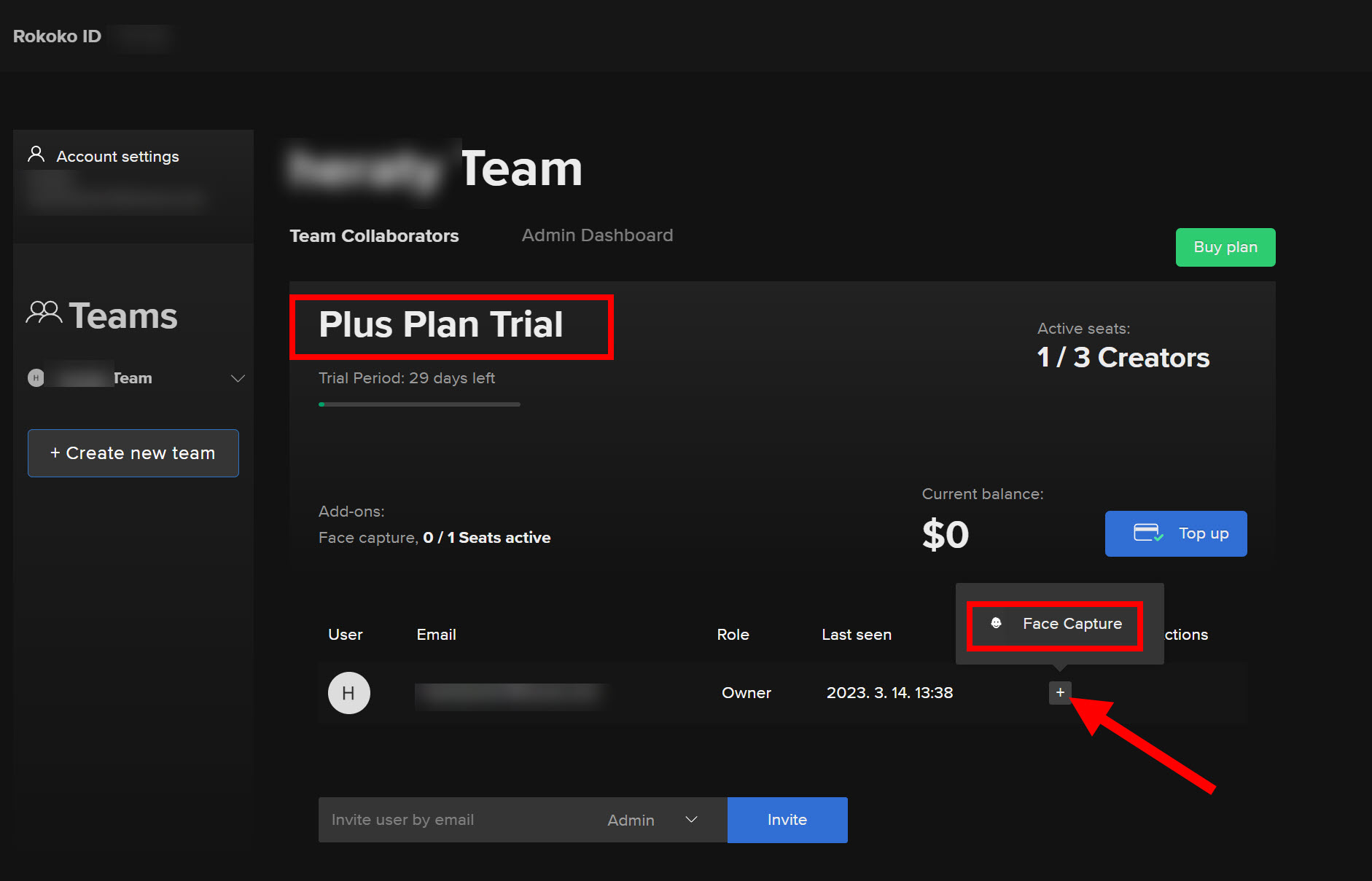 1)예에서 한달동안 무료로 사용할수있는 플러스 계정(plus plan trial)을 구매하고 face capture 애드온을 추가하였습니다(애드온의 경우 추가 비용이 발생합니다)