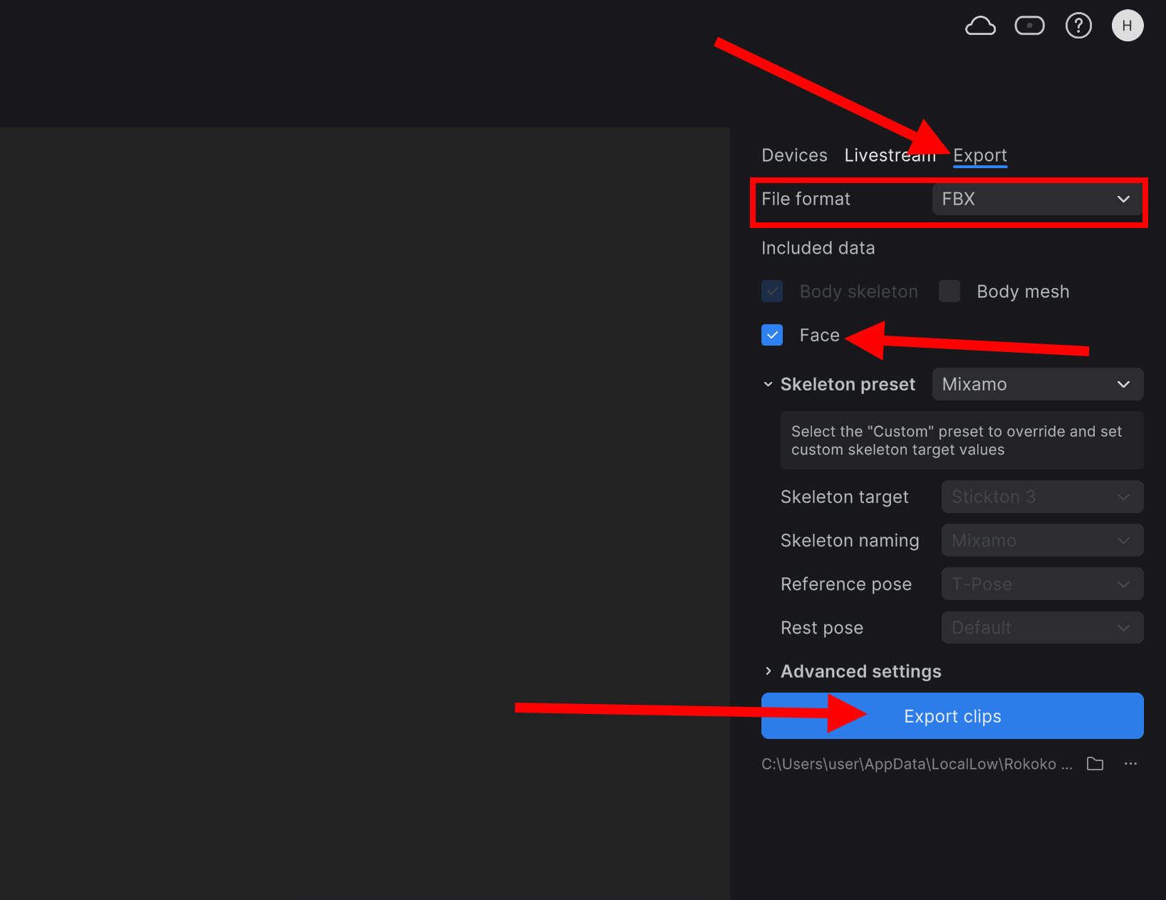 17)rokoko studio 우측의 export를 선택하고 파일 포맷(fbx) 및 옵션을 선택하고 export clips를 클릭합니다.