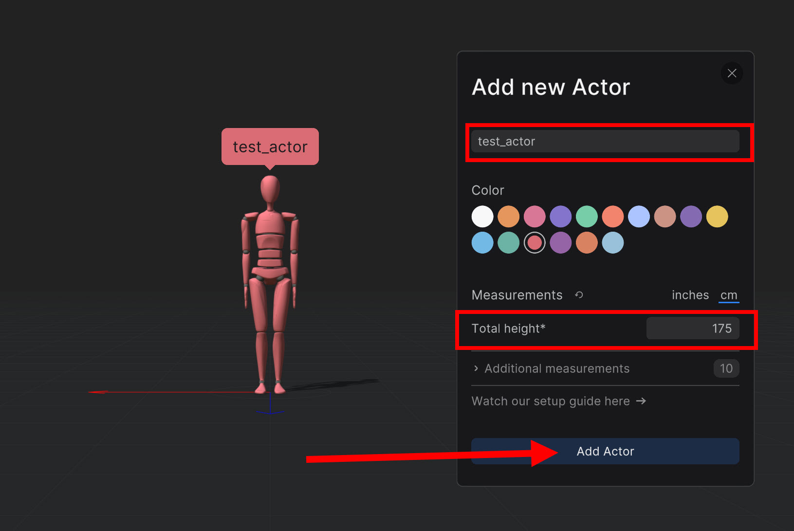 10)actor의 이름 및 높이를 설정하고 add actor를 클릭하면 씬에 actor 오브젝트를 추가합니다.
