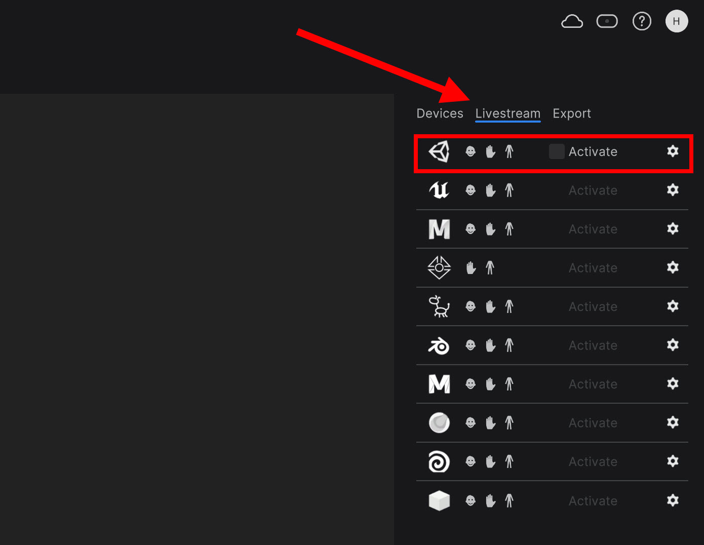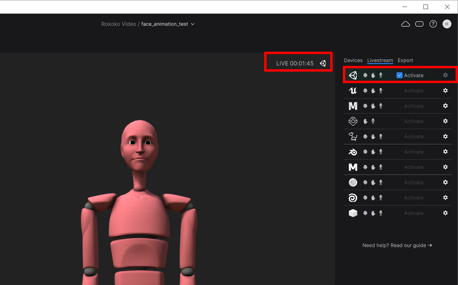 2)rokoko studio의 우측에서 livestream을 선택합니다.