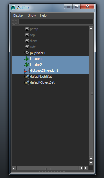 3)아웃라이너(outliner)에서는 시작점과 끝점에 생성된 locator와 거리를 표시하는 distancedimension 노드가 생성된것을 확인할수있습니다.