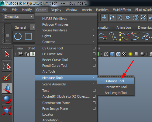 5)상단의 create 메뉴에서 Mesure Tools의 Distance Tool를 선택합니다.