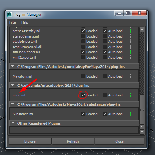 2)mtoa.mll의 loaded에 체크하여 아놀드 렌더러를 불러오기합니다.