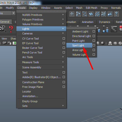 4)씬에 스팟 라이트를 생성합니다. 아놀드 라이트를 생성하려면 상단의 arnold 메뉴에서 light의 Maya Spot Light를 선택합니다.