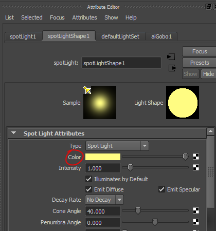 17)spot light attributes의 color를 설정하여 조명의 색상을 설정합니다.