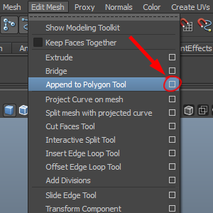 11)오브젝트의 표면에 1개의 시작 폴리곤을 생성하였습니다. 상단의 edit mesh메뉴에서 append to polygon 옵션을 선택합니다.